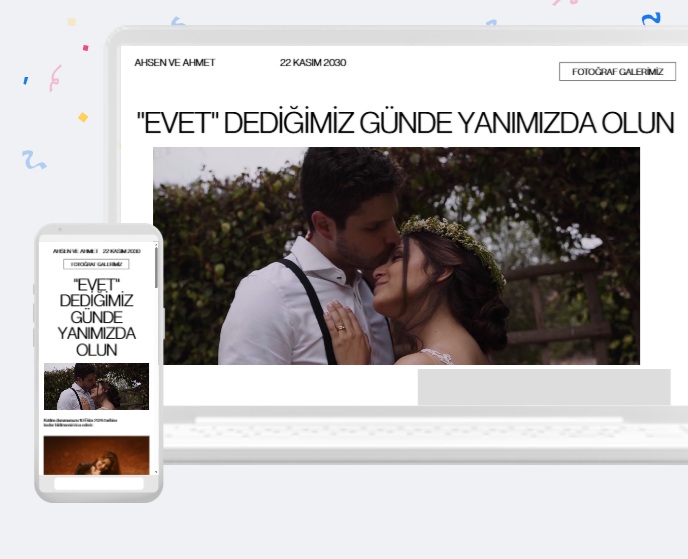 Kendinize özel düğün web sitenizle davetlilerinize sadece bir adres değil, ruhu olan bir davet sunun. En güzel fotoğraflarınız, nasıl tanıştığınız, düğün yeri, tarih ve tüm detaylar… Hepsi özenle sizin için tasarlanıyor.